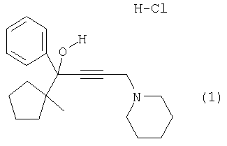 Изобретение относится к области медицины, в частности к производному ряда ацетиленовых аминоспиртов гидрохлорид 1-фенил-1-(1′-метилциклопентил)-4-пиперидино-2-бутин-1-ола (1), обладающему выраженной способностью избирательно блокировать центральные мускариновые рецепторы ацетилхолина M1 подтипа Холинэргическая система принимает участие в регуляции различных жизненно важных функций организма, нарушение которых приводит к возникновению патологических состояний, к числу которых относятся отравления веществами антихолинэстеразного действия, болезнь Паркинсона и Альцгеймера, язвенная болезнь, некоторые типы нарушения сердечного ритма. Среди мускариновых рецепторов ацетилхолина выявлены пять генетически обусловленных подтипов (Kubo Т. et al. Cloning sequencing and expression of complementary DNA encoding the muscarinic acetylcholine receptor, Nature, 1986, Vol. 323, №6087), отличающихся строением, локализацией и функциональной ролью, в то же время в формировании определенных патологических состояний прослеживается важная роль отдельных подтипов М-холинорецепторов (Зеймаль Э.В., Шелковников С.А. Мускариновые холинорецепторы. Л.: Наука, 1989, с.288). Применение лигандов, обладающих избирательными свойствами к определенным подтипам мускариновых рецепторов, основанное на различии их строения, способствует достижению результата лечения при отсутствии (минимализации) побочных действий. Дополнительное расширение круга лигандов, обладающих выраженной избирательностью к определенному подтипу, является источником новых лекарственных препаратов и одновременно служит расширению инструментария для изучения механизмов функционирования центральной нервной системы. Известно, что к антагонистам ацетилхолина обратимого действия, обладающим высокой избирательностью к M1-подтипу, относится препарат пирензепин, применяемый в медицинской практике в качестве противоязвенного средства и проявляющий цитопротективное действие (Реестр лекарственных средств России. Издание 3. М.: РЛС-2001, 2001. С.1048). Обладая высоким сродством к M1 рецептору (Машковский М.Д. Лекарственные средства. Изд.14. М.: Новая Волна. 2000. Т.1. С.215), пирензепин, однако, имеет низкую проницаемость через ГЭБ, что затрудняет его применение в фармакологических тестах, направленных на выявление функций ЦНС. Задача настоящего изобретения состоит в применении низкотоксичного (Долго-Сабуров В.Б., Космачев А.Б., Либман Н.М. и др. Ru №2174510, приоритет от 15.11.1999) соединения 1, обладающего холинолитическим (Либман Н.М., Зацепин Э.П., Пашкевич Б.П. Ru №2155759, приоритет от 25.03.1998) действием, в качестве избирательного M1-холиноблокатора центрального действия при системном введении с целью увеличения набора лигандов, используемых для изучения механизмов функционирования центральной нервной системы. Сущность изобретения иллюстрируется данными таблицы.