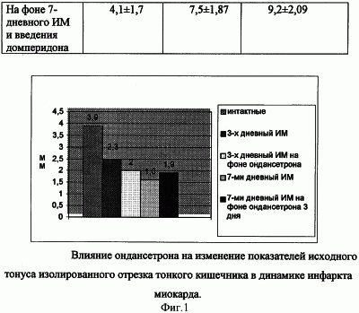 На фиг.1-3 представлены параметры сократимости изолированного отрезка тонкого кишечника при инфаркте миокарда на фоне применения ондансетрона. Моделирование инфаркта миокарда вызывает снижение исходного тонуса изолированного отрезка кишки крысы (фиг.1) по сравнению с интактными животными уже на третьи сутки, и еще большее снижение тонуса (более чем в 2 раза) через 7 суток после коронароокклюзии. Применение препарата ондансетрон в течение 3 дней после моделирования инфаркта миокарда незначительно снижало тонус кишечника на 31% от контроля. Готовность к бариевому спазму (фиг.2) через 3 суток после моделирования ИМ выросла почти в 3 раза, а через 7 суток после коронароокклюзии увеличилась ещё на 4 мм. Применение ондансетрона в течение 3 суток после коронароокклюзии снижало этот показатель несколько ниже нормы (за норму приняты показатели, полученные у интактных животных. Изучение сократимости кишечника в ответ на карбахолин (фиг.3), показало, что через 3 и 7 суток после моделирования ИМ карбахолиновый спазм увеличивается примерно в 2 раза. Применение ондансетрона не влияет на карбахолиновый спазм, усиленный на фоне ИМ.
