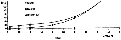 Раствор 30% (HexO)2/Et2 во фторополе – 1083 контактировали с азотнокислым раствором, содержащим нитраты металлов (урана, плутония, америция, европия) при 20°С в течение 3 мин. Коэффициенты распределения приведены на фиг.1 и в табл.1.