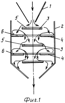 Смеситель-хлопьеобразователь сточной воды работает следующим образом. В загрузочный узел 1 подается сточная вода, поток которой за счет ориентации узла 1 попадает в центр первого диска 3 активатора. На этом диске поток делится на множество элементарных струй, ориентированных по направлению течения от центра к периферии диска 3. Одновременно за счет направляющих 5 данные струи закручиваются в одну сторону. С периферии диска 3 струи срываются и попадают на нижерасположенное кольцо 4, где устремляются к периферии кольца, закручиваясь в другом направлении за счет направляющих потока 5, ориентированных противоположно направляющим потока 6. На контакте кольца 4 со смесительной камерой 2 происходит интенсивное завихрение и перемешивание элементарных струй с одновременным связыванием активно встречающихся и взаимодействующих взвесей в хлопья. Далее этот активно возмущенный поток устремляется к центру кольца и через его отверстие попадает на последующий диск, где снова происходит его разделение на множество уже преобразованных и закрученных элементарных струй. По ходу движения в смесительной камере процесс повторяется, все более интенсифицируя смешение элементарных струй и образование хлопьев взвешенных веществ.