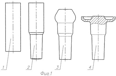 Исходную заготовку 1, полученную из прутка, прокатывают одним из способов прокатки и получают заготовку 2. Затем заготовку 2 передают в штамп первого штамповочного перехода, который состоит из матрицы 5, пуансона 6 и выталкивателя 7. При движении ползуна пресса вниз пуансон 6 в матрице 5 деформирует прокатанную заготовку 2, формируя полуфабрикат 3. Полуфабрикат 3 извлекают из матрицы 5 выталкивателем 7. Полученный полуфабрикат 3 перекладывают в штамп второго штамповочного перехода, состоящего из матрицы 8, пуансона 9, выталкивателя 10. При движении ползуна пресса вниз пуансон 9 деформирует полуфабрикат 3 в матрице 8. В результате получается отштампованная в окончательном штампе поковка 4. После завершения процесса деформации ползун пресса поднимают вверх, поковку 4 удаляют из матрицы 8 выталкивателем 10.