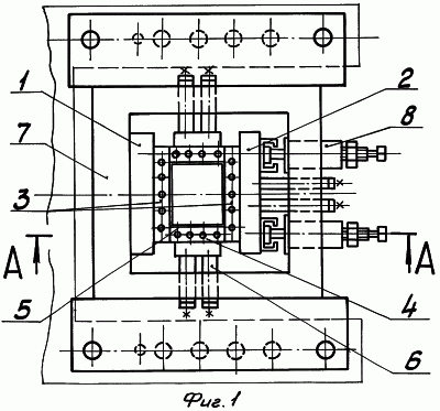 Кроме того, гидроцилиндры работают лишь до полного разогрева стенок кристаллизатора, чтобы увеличить величину рабочего усилия сжатия этих стенок. После чего разливку продолжают при меньшем усилии сжатия стенок, что осуществляется предварительно сжатыми пружинами.