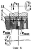 Кроме того, при больших углах наклона дисков они с разным радиальным усилием оказывают давление на заготовку (фиг.5 и 6). Так, при положении зубчатого венца инструмента в крайнем правом положении (фиг.5) относительно обрабатываемой заготовки левый приторцовый диск давит на заготовку с большим радиальным усилием Рmax по сравнению с правым диском, находящимся в зацеплении. Таким образом, выделяется зона интенсивной обработки (фиг.3), инструмент оказывает большее давление на обрабатываемый зуб со стороны торцов, делая его бочкообразным. Зубчатые колеса с бочкообразными зубьями, как известно, находят широкое применение в промышленности.