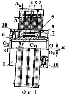 Ступица 1 установлена на подшипниках 5 на косой втулке 6 с помощью пружинных упорных плоских наружных 7 (ГОСТ 13940-80) и внутренних 8 (ГОСТ 13941-80) колец и распорных втулок 9. У косой втулки 6 ось O1-O1 наружной цилиндрической поверхности пересекается под углом с осью О-О внутренней цилиндрической поверхности отверстия в центре оси симметрии ОЦ. При этом ось О-О является продольной осью вращения шпинделя (не показан), на котором закреплен инструмент.