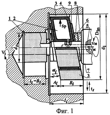 Инструмент совершает вращательное движение со скоростью Vи, а радиальная подача Sp алмазно-абразивных сегментов осуществляется с помощью подачи сжатого воздуха в упругие оболочки кругов, благодаря чему диаметр каждого i-го круга по алмазно-абразивным сегментам становится равным диаметру Din. Шпиндель 7 инструмента совершает поперечную подачу t1, как при обычном врезном шлифовании отверстий. Заготовке придают вращательное движение Vз в противоположном направлении относительно вращения инструмента.