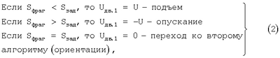 Алгоритм подъема (опускания) отрабатывается следующим образом. После выделения фрагмента изображения поверхности объекта из телевизионного сигнала происходит суммирование всех элементов обрабатываемого изображения и вычисляется площадь его черного фрагмента Sфраг: