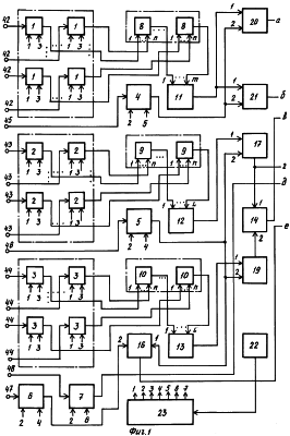 По управляющему сигналу с третьего выхода распределителя 23 импульсов на входы считывания всех элементов первого 1, второго 2 и третьего 3 блоков входных регистров с выходов этих элементов величины bij направляются на входы соответственно первого 8, второго 9 и третьего 10 блоков сумматоров с накоплением. С выходов этих сумматоров значения подаются на входы соответственно первого 11, второго 12 и третьего 13 сумматоров с накоплением. С выхода первого сумматора 11 с накоплением величина Sфраг определяется по формуле (1), засылается на первые входы первого 20 и второго 21 блоков сравнения. С выходов второго 12 и третьего 13 сумматоров с накоплением значения и направляются на первые входы соответственно первого 17 и третьего 19 блоков деления.