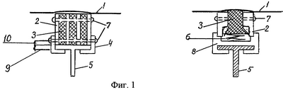 Пластины 3 из углеродного материала подпружинены к контактному проводу 1 посредством пружин 6, а сами пластины 3 и 2 скреплены медными шпильками 7. Крепление токосъемного элемента с подпружиненной графитовой пластиной к полозу осуществляется изгибом горизонтальных выступов П-образной обоймы на 180°, при этом допускается крепление к полозу болтами, проходящими через горизонтальные выступы (см. фиг.2).
