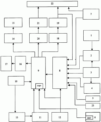 Датчик 1 пути и скорости (ДПС) устанавливается на буксу колесной пары пассажирского электровоза и служит для получения последовательности импульсов, частота которых пропорциональна скорости вращения колесной пары и соответственно скорости движения. С осью колесной пары механически связан диск модулятора, который с помощью, например оптопары, преобразует частоту вращения колесной пары в последовательность импульсов. Блок 2 определения скорости вычисляет скорость движения путем подсчета количества импульсов от датчика 1 пути и скорости на заданном интервале времени с последующим умножением на коэффициент, пропорциональный диаметру колеса. Значение интервала времени поступает с выхода генератора 3 временных меток. Генератор 3 временных меток представляет собой кварцевый генератор с делителем частоты. Он формирует стабильное значение интервалов времени, которые поступают в блок 2 определения скорости и в блок 4 определения текущего времени. Блок 4 определения текущего времени выполнен на базе делителей частоты. Он формирует выходной сигнал, представляющий собой код секунд, минут и часов текущего астрономического времени. Датчики 5 и 23 давления устанавливаются на трубопроводе тормозных цилиндров и уравнительном резервуаре. Они представляет собой электромеханические преобразователи давления в электрический сигнал, например, – ток. Блок измерения 6 напряжения в контактной сети и токов на тяговых двигателях устанавливается в высоковольтной камере и состоит из высоковольтного делителя, выход которого поступает на мультиплексор и с его выхода на АЦП и далее на контроллер, каналы измерения токов на тяговых двигателях также заводятся на мультиплексор и оцифровываются АЦП, результаты измерения передаются в вычислительный блок по последовательному каналу. Пульт 7 управления состоит из контроллера машиниста, с помощью которого машинист в ручном режиме управляет пассажирским электровозом в режиме тяги и электродинамического торможения и крана машиниста для управления электропневматическим и пневматическим торможениями. Если машинист принимает решение управлять пассажирским электровозом вручную от указанных органов управления, в первый блок 8 сопряжения поступает соответствующий сигнал и система управления переходит в режим советчика. Кроме того, от пульта 7 управления поступают релейные сигналы о наличии напряжения в контактной сети, о срабатывании автостопа и сигнал о боксовании колесных пар пассажирского электровоза. Также от пульта управления поступают сигналы автоматической локомотивной сигнализации о допустимых скоростях движения, которые формируются штатной системой безопасности и они повторяют сигналы напольных светофоров. Система управления движением пассажирского электровоза с пульта 7 управления получает следующие потенциальные сигналы автоматической локомотивной сигнализации: зеленый огонь – разрешается движение; на путевом светофоре, к которому приближается поезд, горит зеленый огонь, желтый огонь – разрешается движение; на путевом светофоре, к которому приближается поезд, горит один или два желтых огня, красно-желтый огонь – разрешается движение с готовностью остановиться; на путевом светофоре, к которому приближается поезд, горит красный огонь, белый огонь указывает, что локомо