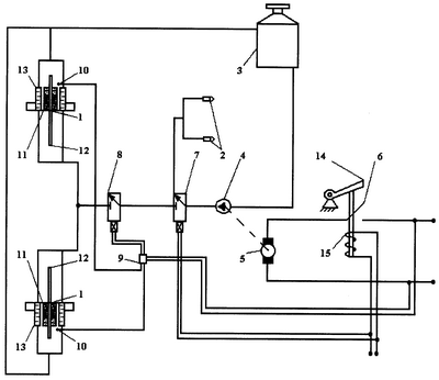 При нажатии на ручной привод 14 включения стеклоомывателя выключатель 6 замыкается и электродвигатель 5 приводит в действие насос 4, который нагнетает жидкость из резервуара 3 через клапан 7 к форсункам 2. В случае торможения от цепи стоп-сигнала напряжение подается на электромагнит 15, который замыкает выключатель 6. Одновременно клапан 7 разобщает насос 4 и форсунки 2 и сообщает насос 4 с клапаном 8. Если торможение протекает без чрезмерного нагрева тормозных дисков и тормозных колодок, пороговое устройство 9 не подает напряжение на электромагнит клапана 8 и жидкость через тормозные колодки 13 не циркулирует. При длительном торможении температура тормозных дисков и тормозных колодок повышается выше допустимой, пороговое устройство 9, сравнивающее сигнал датчиков 10 с заранее заданной пороговой величиной, подает напряжение на электромагнит клапана 8. Клапан 8 открывается и пропускает жидкость от насоса 4 в тормозные колодки 13, охлаждая их тем самым. После снижения температуры тормозных дисков и тормозных колодок до величины, меньше пороговой, устройство 9 обесточивает электромагнит клапана 8 и подача жидкости через тормозные колодки 13 прекращается.