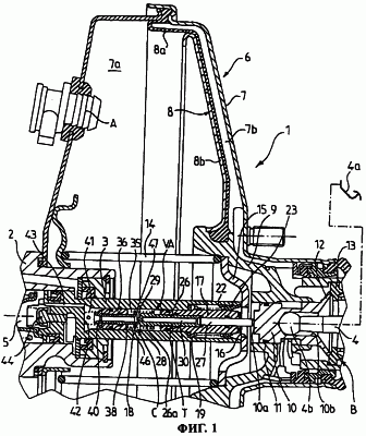 Управляющий стержень 4 соединен с усилителем 6 пневматического типа. Этот усилитель 6 имеет прочный корпус 7, герметично разделенный внутри на две камеры 7а, 7b подвижной перегородкой 8, состоящей из диафрагмы 8а, изготовленной из эластичного материала, и жесткой юбки 8b. Камера 7а через штуцер A постоянно соединена с источником частичного разрежения (не показан). К юбке 8b крепится пневматический поршень 9, выполненный в виде цилиндрической втулки, ось которой совпадает с осью главного поршня 3. Пневматический поршень 9 может герметично перемещаться по внешней поверхности выполненного в виде цилиндрической втулки плунжера-распределителя 10. Уплотнение между плунжером-распределителем и пневматическим поршнем осуществляется с помощью круглого уплотнительного кольца 11. На переднем конце плунжера 10 имеется выступ 10а относительно небольшого диаметра, а в задней части плунжера выполнено глухое открытое сзади отверстие 10b, образующее гнездо головки 4b, расположенной на переднем конце управляющего стержня 4.