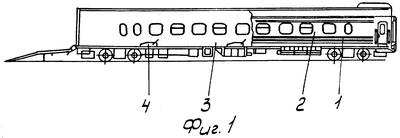 Грузопассажирский вагон для перевозки колесной техники 1 (фиг.1) содержит жилой отсек 2 и гараж 3 для размещения двух перевозимых автомобилей, крепление которых в гараже 3 осуществляется опорами-замками 4 за шины колес.