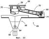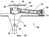 Это устройство 59 дополнено рядом несущих и, предпочтительно, приводных роликов, например двумя комплектами 64 и 65 из трех роликов, соответственно установленными на платформах 61 и 62 и предназначенными для приема, перемещения и, возможно, но не обязательно, продолжения поворота грузовой железнодорожной конструкции 6 путем воздействия на ее дно, как только ее нависание над платформой переходит определенную границу, обеспечивая тем самым достаточную устойчивость и безопасность движений поворота. Ролики этих комплектов 64 и 65 установлены в углубление в конструкции платформы, как показано на Фиг.3, на достаточном удалении от края платформы. Они слегка выступают над поверхностью платформы для беспрепятственного перемещения дна грузовой конструкции, нависающего над платформой. Эти ролики 66 предпочтительно являются механизированными и выполнены в виде узлов, каждый из которых образован вращающимся цилиндром, по существу имеющим форму усеченного конуса для дифференцирования разности круговых скоростей от одного конца к другому во избежание пробуксовывания. Их боковая поверхность предпочтительно покрыта металлическим ободом 67, входящим в контакт с опорной дорожкой качения 29 (Фиг.26), выполненной по меньшей мере на одном конце грузовой железнодорожной конструкции 6 вагона. Они содержат электрический двигатель 68, вращающий ролик.