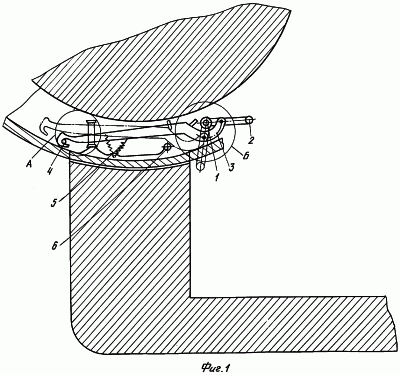 Пружина 5 при этом прижимает тело крюка к направляющей-ограничителю 7 и в конце движения к ролику-упору 6, поднимая головную часть крюка 3 над элементом ответной части замка 4, обеспечивая гарантийный зазор при открытии между головной частью крюка и элементом ответной части замка.