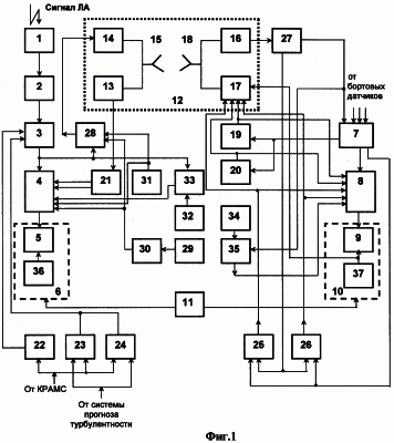 Поступающая на борт информация о координатах ЛА и скоростях ветра разделяется бортовым разделителем 27 так, что информация о координатах ЛА поступает с первого выхода 27 в ПНБ 7, а затем, суммируясь с данными бортовых датчиков, преобразуется БВП 8 и отображается на индикаторе пилота 9. Метеорологическая составляющая наземной информации с второго выхода блока 27 поступает в блоки 25 и 26, куда также поступает через ПНБ 7 наземная информация о координатах ЛА и линиях курса и глиссады, а также бортовая информация (от бортовых датчиков) о скоростях ЛА, оборотах двигателей, запасе топлива и т.д.