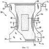 На фиг.6 приведена схематическая иллюстрация набора 3 изделий 5, совмещенного между двумя ленточными транспортерами 36 и 38. При использовании компрессионной упаковки сжатие может быть приложено к отдельным изделиям 5, изделиям 5 в наборе 3 или к отдельному изделию 5 и набору 3. Если сжатие прикладывается к изделиям в наборе, то ленточные транспортеры 36 и 38 будут компрессионными ленточными транспортерами. Каждый ленточный транспортер 36 и 38 соответственно содержит элемент 39 и 40. Каждый ленточный транспортер 36 и 38 может обеспечивать приложение силы сжатия к набору 3 изделий 5. При приложении силы сжатия набор 3 изделий 5 сжимается приблизительно до 0-90%, более характерно – приблизительно до 0-80%, еще более характерно – приблизительно до 10-75%, а характернее всего – приблизительно до 20-70% его объема в несжатом состоянии в направлении, указанном стрелками F, благодаря движению элементов 39 и 40 в направлении друг к другу под действием силы, которая может составлять 2000 кг. После совмещения или сжатия набора 3 ленточные транспортеры 36 и 38 вводятся через нижнюю поверхность 44 пакета 42, как показано на фиг.7. Набор 3 изделий 5 вводят в пакет 42 путем вращения ленточных транспортеров 36 и 38. После того, как набор 3 вставлен в пакет 42, ленточные транспортеры 36 и 38 извлекают из пакета 42, который затем герметизируют на нижней поверхности 44 (загрузка набора 3 изделий 5 может быть также осуществлена путем применения толкательного устройства). Пакет 42 имеет ручку 41 и открывающее устройство 43, которое образовано линией перфораций на одной из боковых поверхностей 45 или 46 пакета 42. Это один способ упаковки сжатых изделий 5. Предполагается, что настоящее изобретение не ограничено этим особым вариантом осуществления для упаковки сжатых изделий 5.