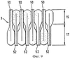 На фиг.9 иллюстрируется предпочтительная ориентация изделий 50 и 52, будь они поглощающими или другими изделиями, соответствующая настоящему изобретению. Число верхних секций 11 и нижних секций 13 изделий 50 и 52 в первой области 15 набора 3 равно числу верхних секций 11 и нижних секций 13 изделий 50 и 52 во второй области 17 набора 3 или отличается на единицу. В этом случае сила сжатия, необходимая для сжатия первой области 15, по существу равна силе сжатия, которая требуется для сжатия второй области 17 набора 3.