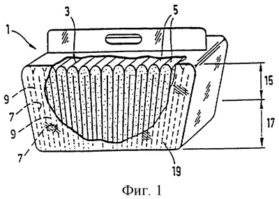 На фиг.1 приведена иллюстрация упаковки 1, содержащей набор 3 сложенных гибких изделий 5, например поглощающих изделий, набор 3 имеет первую область 15 и вторую область 17. Изделия 5 могут быть сжаты в упаковке 1. Изделия 5 могут быть подгузниками, мужскими трусами, защитными элементами мужской одежды, гигиеническими прокладками, прокладками для страдающих недержанием или любым другим видом поглощающего изделия, а также одеждой, халатами, хирургическими простынями, защитными масками и другими предохранительными оболочками. Будучи сжатыми изделия 5, в частности поглощающие изделия, имеют объем, составляющий приблизительно 0-90%, более типично – приблизительно 0-80%, типичнее – 10-75%, а типичнее всего – 20-70% их объема в несжатом состоянии. Изделия 5 содержатся в гибкой внешней оболочке 19, причем на фиг.1 некоторая часть конструкции гибкой внешней оболочки вырезана для того, чтобы нагляднее показать набор 3 изделий 5, которые в этом случае являются поглощающими изделиями, в упаковке 1. Гибкая внешняя оболочка 19 поддерживает набор 3 изделий 5 (сжатых или несжатых) и может содержать термопластичный или бумажный пакет, как это известно на предшествующем уровне техники.