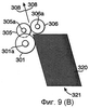 Как и в предыдущем случае, датчики 308 обнаруживают проход бумаги и используются для управления электродвигателем системы захвата (непоказанным), который обеспечивает приведение во вращение захватывающих роликов 301.