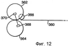 В примере по фиг.11 устройства 309А, 309В обнаружения являются отражательными. На фиг.12 проиллюстрировано передаточное устройство. В этом случае банкноты (непоказанные) в приспособлении для хранения опираются на подающую пластину 360, и толкающий ролик (непоказанный) толкает их вперед обычным образом. Самая нижняя бумага подается в место зажима между парой подающих роликов 362, 364, в то время как неподвижный или медленно вращающийся в противоположном направлении листоотделяющий ролик 366 предотвращает подачу более одного листа или бумаги. Источник 368 излучения создает луч, который будет обнаружен устройством 370 обнаружения при подаче самой передней бумаги через место зажима между роликами 362, 364, и тем самым позволяет определить такие характеристики подаваемой бумаги, как наличие двух бумаг, состояние бумаги, ее подлинность, рисунок и т.п.