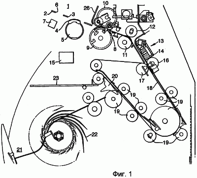 Устройство для сортировки бумаг, показанное на фиг.1, содержит входной бункер 1, имеющий основание 2 с отверстием 3, через которое может выступать имеющая высокий коэффициент трения часть 4 толкающего колеса 5. Основание 2 имеет второе отверстие 6, выровненное относительно устройства 7 для считывания штрихового кода, как более подробно будет описано ниже. Банкноты, расположенные в виде стопы на основании 2, опираются на переднюю стенку 26 и подаются периодически за счет поворота толкающего ролика 5 в место 8 зажима между фрикционным подающим роликом 9, имеющим высокий коэффициент трения, и листоотделяющим роликом 10, вращающимся в противоположном направлении. Бумаги проходят через прижимные валики 11, 12 в зону 13 распознавания рисунка, в которой датчик 14 сканирует банкноту по мере ее подачи и передает информацию в микропроцессор 15, который управляет всей работой машины. После этого каждая банкнота подается через прижимные валики 16, 17 на приводной ремень 18, который обеспечивает перемещение банкноты вокруг различных роликов 19 к отклоняющей перегородке 20. Положение отклоняющей перегородки 20 регулируется с помощью микропроцессора 15, так что банкноты направляются или в сторону наружного кармана (магазина) 21, где они укладываются в стопу путем использования вращающегося барабана 22, предназначенного для укладки в стопу, обычным образом, или в магазин 23 для отбракованных банкнот.