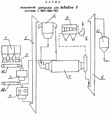Получение цемента или добавки осуществляется следующим образом: цементный клинкер и/или добавка фракции 30-50 мм из (Б)1 через (П-Д) 2 с помощью (Т) 11 подают в (ЭМ) 3, далее указанные материалы по (Т) 12 подают в (ПВИ) 4, где они предварительно измельчаются до размеров частиц 100-1000 мкм. Далее (Э) 5 клинкер и/или добавку подают в (К) 6, где они разделяются на две фракции и мелкая фракция размером до 1000 мкм поступает в (ТМ) 7, а крупная фракция размером более 1000 мкм возвращается в (ПВИ) 4 для повторного измельчения. После чего ведут помол в (ТМ) 7 до удельной поверхности 4200 см2/г и остатка на сите до 4,4% на сите 008, т.е. размера частиц от 10 до 80 мкм. Зерновой состав полученного цемента или добавки следующий (мас.%): 80 мкм – 5, 60 мкм – 20, 50 мкм – 20, 30 мкм – 50, 10 мкм – 5.