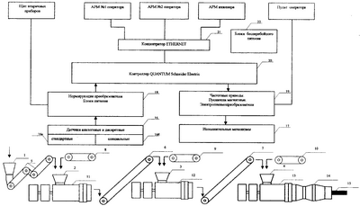 Нижний уровень программно-технического комплекса (ПТК) строится на контроллерах серии QUANTUM фирмы Schneider Electrik (20) и включает в себя кроме стандартных первичных (16а), нормирующих преобразователей и блоков питания (18), пусковой аппаратуры (19), исполнительных механизмов (17) целую серию специально разработанных для данной системы нестандартных малогабаритных измерителей (16б) температуры, давления, уровня, скорости выхода изделия, вращения валов, замера геометрических размеров, контроля сплошности и внешнего вида изделий.