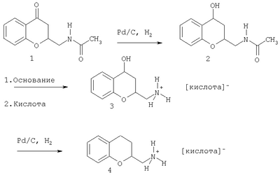 Последующее удаление ацетиловой группы дает (R)-2-аминометилхроман-4-ол и, в зависимости от обработки, его соли. Восстановление в присутствии катализатора из благородного металла дает (R)-2-аминометилхроман и, в зависимости от обработки, его соли. Аналогичными промежуточными соединениями в реакции (S)-N-(4-оксохроман-2-ил-метил)ацетамида являются (S)-N-(4-гидроксихроман-2-илметил)-ацетамид и (S)-2-аминометилхроман-4-ол.