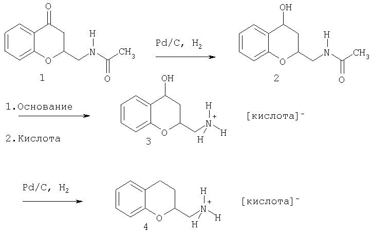 Начиная от соединения N-(4-оксохроман-2-илметил)ацетамид 1, карбонильную группу гидрогенизируют до гидроксильной группы с использованием катализатора из благородного металла, например с использованием Pd на угле (влажность 50%), чтобы получить соединение N-(4-гидроксихроман-2-илметил)ацетамид 2. Ацетиловую группу отщепляют при помощи основания, например гидроксида натрия. Добавление кислоты приводит к получению соли с кислотным остатком 3 2-аминометилхроман-4-ола. Дальнейшая гидрогенизация с использованием катализатора из благородного металла позволяет получить соль с кислотным остатком 4 2-аминометилхромана.