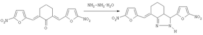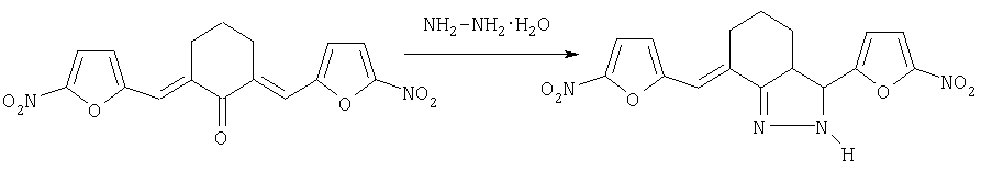 Изобретение относится к новому гетероциклическому соединению, в частности 3-(5-нитрофурил)-7-(5-нитрофурфурилиден)-3,3а,4,5,6,7-гексагидро-2Н-индазолу формулы 1 который проявляет противомикробную активность по отношению к бактериям рода Staphylococcus и может найти применение в медицине. Соединение формулы 1 получают реакцией 2,6-ди-(5-нитрофурфурилиден)-циклогексанона с гидразингидратом в среде пропанола-2. Выход 80%, т.пл. 193-195°С; брутто-формула С16N14N4О6; LD50 при внутрибрюшинном введении 500 мг/кг. Это соединение превосходит по активности фурацилин в 16 раз и фуразолидон в 2-31 раза. Технический результат – получение соединения, обладающего более высокой, избирательной антимикробной активностью и невысокой токсичностью. 3 табл.
