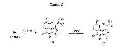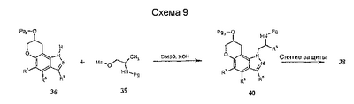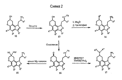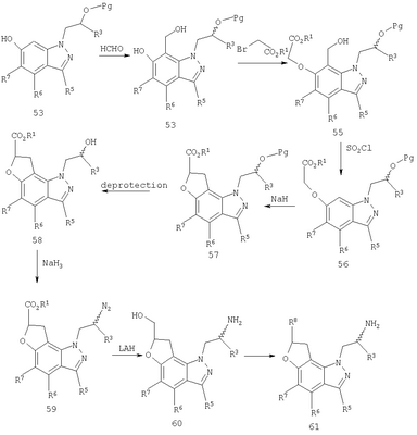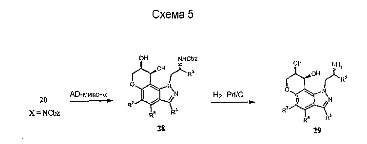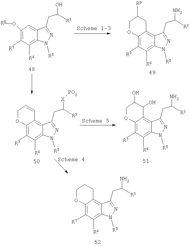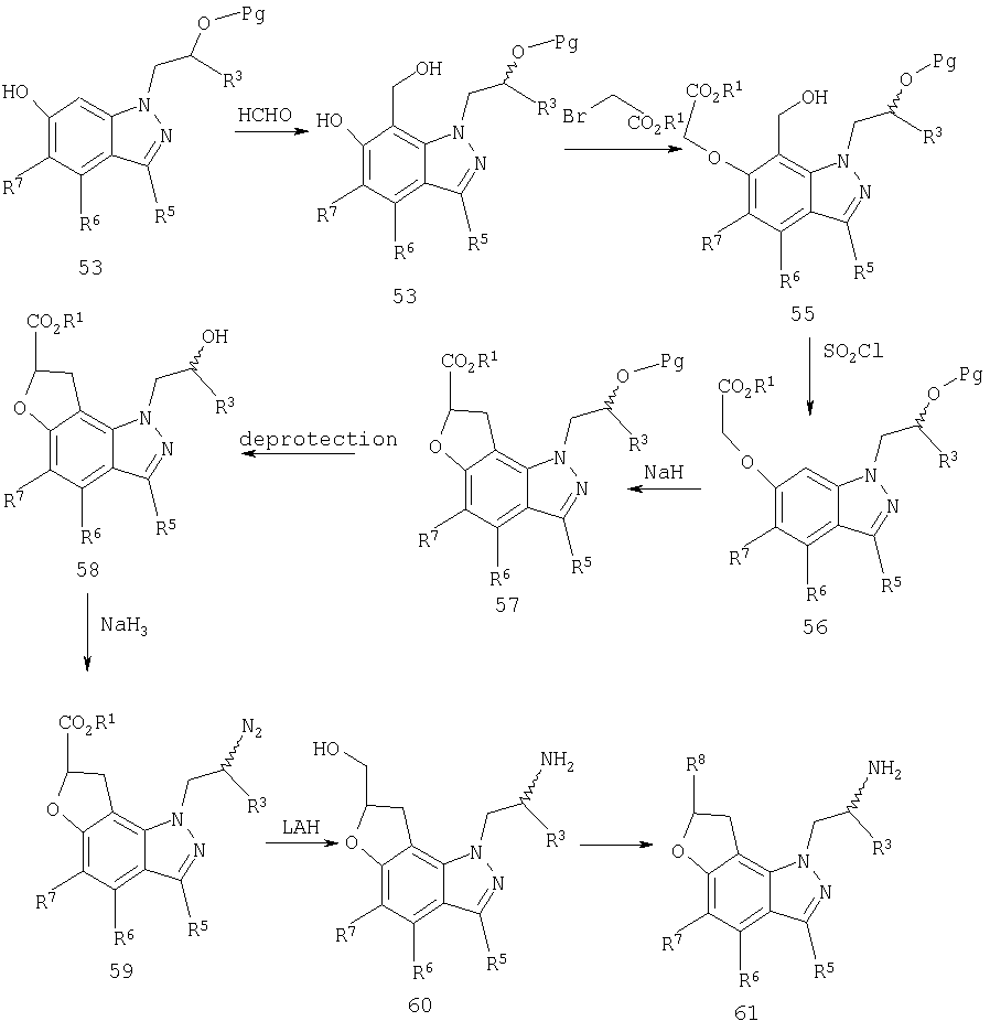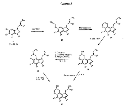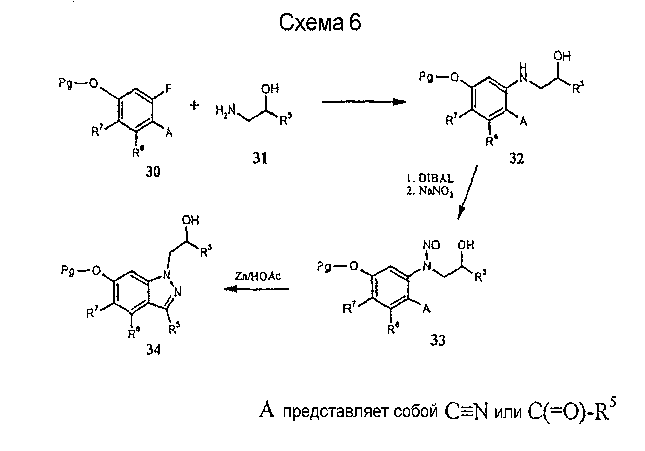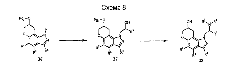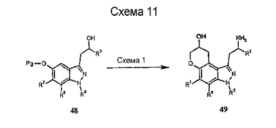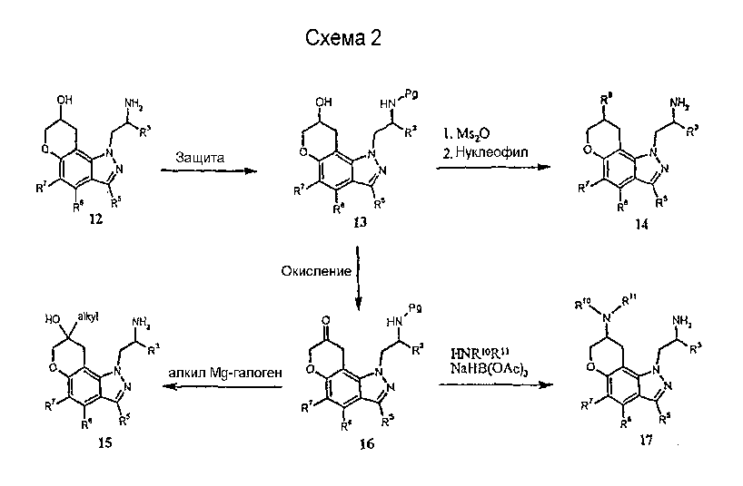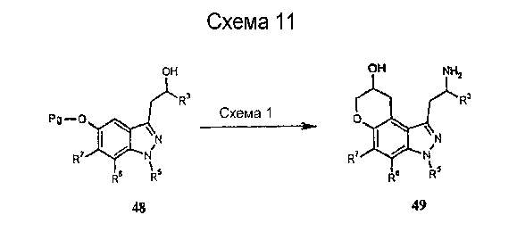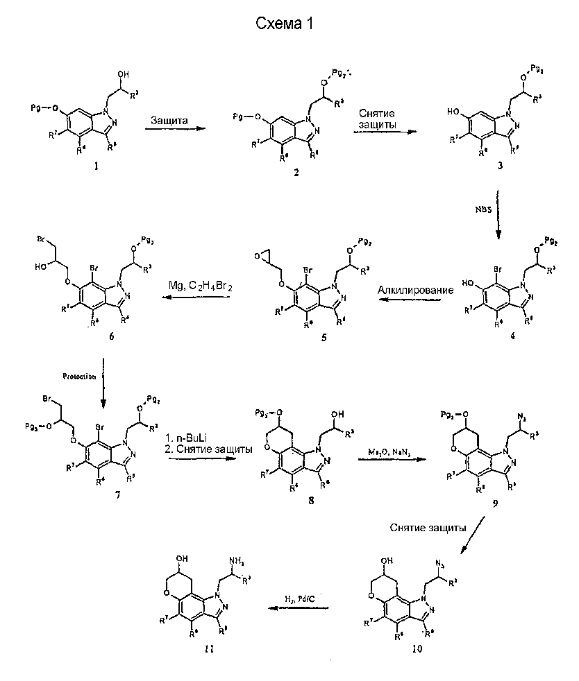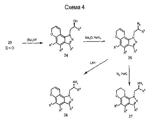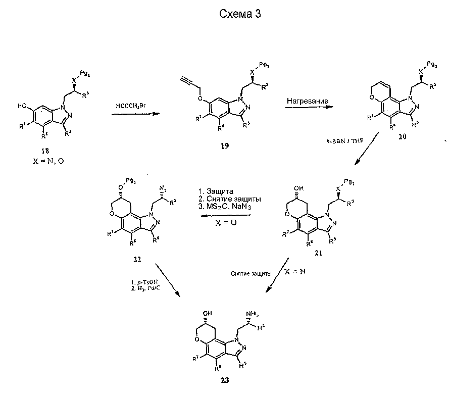 Другие варианты осуществления настоящего изобретения будут понятны специалисту в данной области на основе приведенного описания и практики осуществления настоящего изобретения, рассмотренной в настоящем материале. Следует иметь в виду, что настоящее описание и примеры следует рассматривать только как иллюстративные, поскольку сущность и объем настоящего изобретения определены формулой изобретения и ее эквивалентами. Пример 17 (S)-1-метил-2-(3,7,8,9-тетрагидропирано-[3,2-е]-индазол-1-ил)этиламин Стадия А: 3-((R)-2-гидроксипропил)-1Н-индазол-5-ол К раствору (R)-1-(5-метокси-1Н-индазол-3-ил)пропан-2-ола (2,31 г, 11,2 ммоль) в безводном дихлорметане (50 мл), охлажденному при -78°С, добавляют 1 н. раствор трибромида бора в дихлорметане (33,6 мл, 33,6 ммоль). После завершения введения смеси позволяют нагреться до температуры окружающей среды и перемешивают в течение 2 ч. Смесь охлаждают (на бане со льдом) и гасят 20 мл воды. Дихлорметан выпаривают и остаток смешивают с этилацетатом (100 мл). К данному раствору добавляют небольшими порциями карбонат калия до тех пор, пока не прекратится выделение газа, и рН не станет примерно 8. Смесь экстрагируют этилацетатом (3×100 мл) и объединенные экстракты сушат и выпаривают досуха. Хроматографией на диоксиде кремния (градиент, 50-90% этилацетата в гексане) получают масло (1,50 г, 70%): LC/MS (+APCI) m/z 193 (М+Н). Стадия В: (R)-1-(5-проп-2-инилокси-1Н-индазол-3-ил)-пропан-2-ол К перемешиваемой смеси продукта со стадии А (1,50 г, 7,81 ммоль) в смеси этанола в воде (50 мл/10 мл) добавляют карбонат калия (1,62 г, 11,7 ммоль) и пропаргилбромид (80% в толуоле, 1,74 г, 11,7 ммоль). Смесь нагревают при 75°С в течение 2 ч в атмосфере азота, выпаривают досуха, смешивают с насыщенным водным раствором бикарбоната натрия (50 мл) и экстрагируют этилацетатом. Хроматографией на диоксиде кремния (градиент, 25-95% этилацетата в гексане) получают масло (1,25 г, 69%): LC/MS (+APCI) m/z 231 (М+Н). Стадия С: 3-[(R)-2-(трет-бутилдиметилсиланилокси)пропил]-5-проп-2-инилокси-1Н-индазол К перемешиваемому раствору продукта со стадии В (1,25 г, 5,43 ммоль) в безводном ТГФ (тетрагидрофуране) (50 мл) добавляют трет-бутилдиметилсилилхлорид (1,23 г, 8,15 ммоль), имидазол (0,74 г, 10,9 ммоль) и каталитическое количество DMAP (0,1 г). Смесь перемешивают в течение 6 ч и вводят дополнительное количество каждого из реагентов. Смесь перемешивают до утра и объединяют с насыщенным водным раствором бикарбоната натрия (100 мл) и экстрагируют этилацетатом. Хроматографией на диоксиде кремния (градиент, 2-30% этилацетата в гексане) получают масло (0,98 г, 52%). Данный продукт медленно разлагается при выдерживании во влажных условиях с получением желаемого продукта. Хроматографией смеси получают дополнительный желаемый продукт в виде масла (0,68 г, 36%, суммарно 88%): LC/MS (+APCI) m/z 345 (М+Н). Стадия D: 1-[(R)-2-(трет-бутилдиметилсиланилокси)пропил]-3,7-дигидропирано-[3,2-е]-индазол Смесь продукта со стадии С (1,66 г, 4,82 ммоль) в мезитилене (8 мл) помещают в реакционный сосуд, продувают газообразным азотом в течение 5 мин и герметизируют. Сосуд нагревают при 210°С в течение 1 ч, охлаждают до температуры окружающей среды и хроматографируют на диоксиде кремния (градиент, 2-15% этилацетата в гексане) с получением масла (1,31 г, 79%): LC/MS (+APCI) m/z 345 (М+Н). Стадия Е: (R)-1-(3,7-дигидропирано-[3,2-е]-индазол-1-ил)пропан-2-ол Смесь продукта со стадии D (0,30 г, 0,87 ммоль) и тетрабутиламмонийфторида (0,5 М, 2,62 мл, 1,31 ммоль) в ТГФ (30 мл) перемешивают при те