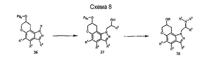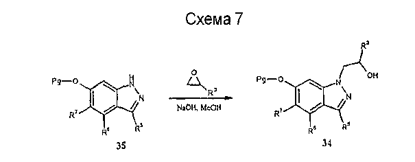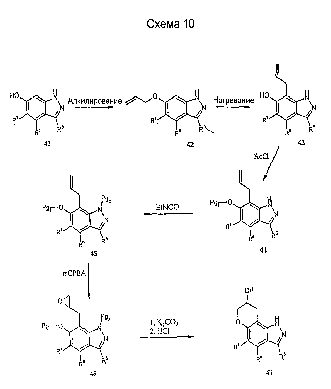 Способ получения 1 1,7,8,9-тетрагидропирано[2,3-g]индазол-8-ол Стадия А: 6-аллилокси-1Н-индазол К раствору 1Н-индазол-6-ола (20,0 г, 150 ммоль) в ацетоне (450 мл) добавляют измельченный карбонат калия (22,4 г, 162 ммоль), карбонат цезия (2,00 г, 5,7 ммоль) и аллилиодид (14,63 мл, 160 ммоль) и смесь перемешивают в течение 18 часов при температуре окружающей среды. Добавляют дополнительное количество карбоната калия (5,00 г, 36 ммоль) и аллилиодида (1,4 мл, 15 ммоль) и смесь перемешивают еще 2 часа и затем фильтруют. К фильтрату добавляют воду (200 мл) и объем смеси уменьшают в вакууме до половины (вдвое) и экстрагируют дихлорметаном (2х100 мл). Объединенные экстракты сушат (MgSO4) и выпаривают с получением остатка, который очищают хроматографией (силикагель, 20% – 50% EtOAc/гексан) с получением желтого твердого вещества (14,7 г, 56%): Тпл – 110-112°С; LC/MS (+APCI) m/z 175 (M+H). Непрореагировавший исходный материал отбрасывают (4,71 г). Стадия В: 7-аллил-1Н-индазол-6-ол Раствор продукта, полученного на стадии А (14,2 г, 82 ммоль), в 1,2-дихлорбензоле (90 мл) кипятят с обратным холодильником в течение 6 часов и реакционную смесь выпаривают до получения остатка, который очищают хроматографией (силикагель, EtOAc) с получением рыжевато-коричневого твердого вещества (8,59 г, 60%), которое используют на следующей стадии: LC/MS (+APCI) m/z 175 (M+H). Стадия С: 7-аллил-1Н-индазол-6-иловый эфир уксусной кислоты Раствор продукта, полученного на стадии В (6,35 г, 37 ммоль) в ТГФ (100 мл), содержащий триэтиламин (7,6 мл, 55 ммоль), перемешивают в течение 5 минут при температуре окружающей среды, охлаждают до 0°С (ледяная баня) и добавляют ацетилхлорид (2,63 мл, 37 ммоль). Смесь перемешивают при 0°С в течение 2 часов, вносят дополнительное количество ацетилхлорида (0,26 мл, 3,7 ммоль) и смесь перемешивают в течение 10 минут, после чего вносят еще порцию ацетилхлорида (0,26 мл, 3,7 ммоль) и перемешивание продолжают в течение 15 минут. Реакцию гасят добавлением триэтиламина (1 л) и насыщенного водного раствора бикарбоната натрия (100 мл) и проводят экстракцию этилацетатом (100 мл). Экстракты сушат (MgSO4) и выпаривают до получения масла (9,27 г), которое очищают хроматографией (силикагель, 10% – 50% EtOAc/гексан) с получением белого твердого вещества (3,5 г, 44%): LC/MS (+APCI) m/z 217 (M+H). Стадия D: 7-аллил-1-этилкарбамоил-1Н-индазол-6-иловый эфир уксусной кислоты К раствору продукта, полученного на стадии С (2,5 г, 11,6 ммоль), в ТГФ (10 мл) добавляют этилизоцианат (1,01 мл, 13 ммоль) и смесь нагревают при 70°С в течение 18 часов. Реакционную смесь выпаривают с получением остатка, который очищают хроматографией (силикагель, 10% – 50% EtOAc/гексан) с получением бесцветного масла (2,7 г, 81%): LC/MS (+APCI) m/z 288 (M+H). Стадия Е: 1-этилкарбамоил-7-оксиранилметил-1Н-индазол-6-иловый эфир уксусной кислоты К раствору продукта, полученного на стадии D (2,70 г, 9,4 ммоль), в дихлорметане (15 мл) добавляют 3-хлор-пербензойную кислоту (2,31 г, 10,3 ммоль, 77% чистоты) и смесь перемешивают при температуре окружающей среды в течение 1 часа. Вносят дополнительное количество 3-хлор-пербензойной кислоты (0,2 г, 0,9 ммоль) и реакцию проводят еще в течение 3 часов. Далее реакцию гасят добавлением насыщенного водного раствора бикарбоната натрия (100 мл) и проводят экстракцию дихлорметаном (50 мл). Экстракт сушат (MgSO4) и выпаривают с получением белого твердого вещества (1,59 г, 56%): Тпл. – 110-111°С; LC/MS (+APCI) m/z 304 (M+H). Стадия F: 1,7,8,9-тетрагидропирано[2,3-g]индазол-8-ол К раствору продукта, полученного на стадии Е (1,44