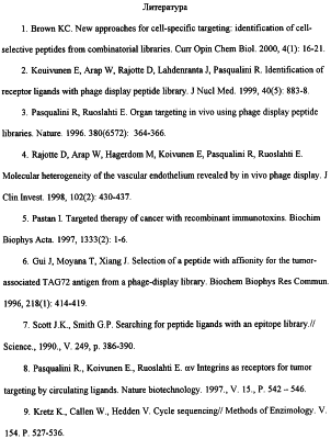 В последние годы с помощью селекции фаговых библиотек против очищенных клеточных маркеров, культур клеток и даже in vivo на животных удалось идентифицировать целый ряд пептидов, специфичных в отношении тех или иных клеток [1]. Ранние работы в этой области касаются выделения пептидных лигандов для интегринов, представляющих класс гетеродимерных белков клеточной адгезии, выполняющих многие важные биологические функции, такие как рецепция матриксных белков и факторов роста, иммунологический контроль и др. [2]. Было показано, что пептиды, селектированные на очищенных интегринах, могут использоваться для избирательного связывания с клетками-мишенями. Селекция фаговых библиотек по связыванию с интактными клетками имеет ряд преимуществ, так как не требуется информация о предполагаемых рецепторах. Впервые этот подход был использован для выделения 20-мерного пептида, связывающегося с фибробластами [1]. Группа Ruoslahti из La Jolla Cancer Research Center разработала систему селекции in vivo, позволяющую выделять из пептидной фаговой библиотеки фаги, избирательно связывающиеся с различными органами и тканями [3]. Было показано, что органоспецифические фаги связываются с соответствующим органом в 4-9 раз лучше, чем в контроле. Органоспецифические фаги идентифицированы для легких, кожи, поджелудочной железы, тонкого кишечника, матки, надпочечников и сетчатки. При этом установлено, что фаг, связывающийся с легочной тканью, обладал наибольшей селективностью – в 35 раз больше, чем неселективный фаг [4].