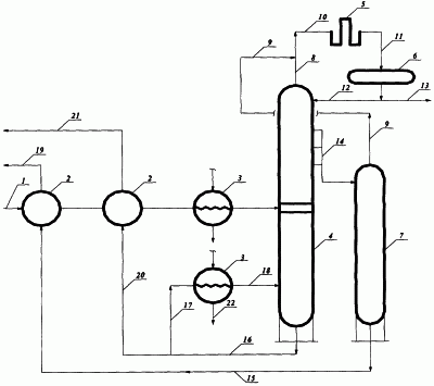 На чертеже приведена принципиальная схема реализации предлагаемого способа. Она содержит сырьевую линию 1, теплообменники 2, пароподогреватели 3, ректификационную колонну 4, конденсатор-холодильник 5, рефлюксную емкость 6, отпарную колонну 7, линию головного погона ректификационной колонны 8, линию отгона отпарной колонны 9, линию потока смеси паров бензиновых фракций на конденсацию 10, линию потока смеси конденсата бензиновых фракций в рефлюксную емкость 11, линию острого орошения ректификационной колонны 12, линию потока избытка смеси бензиновых фракций на компаундирование 13, линию потока флегмы бокового погона фракции дизельного топлива 14, линию потока фракции дизельного топлива на регенерацию тепла 15, линию потока котельного топлива 16, линии потока горячей струи ректификационной колонны 17 и 18, линию потока товарного дизельного топлива с установки 19, линию потока избытка котельного топлива на регенерацию тепла 20, линию потока избытка товарного котельного топлива с установки 21, линию потока водяного пара 22.