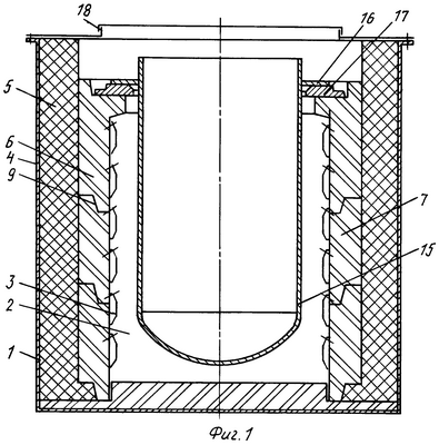 Устройство работает следующим образом. Монтаж печи производят следующим образом. В металлический кожух 4 на подине укладывают слой из шамотного кирпича с выступами под установку цилиндрических съемных блоков 7, которые готовят заранее из высокопрочного, химически и термически стойкого огнеупорного материала, например керамобетона или фторфлогопита, цельными 11 или в виде полуколец 12. Блоки соединяют между собой выступами 9 и пазами 10 по типу шип-паз 8, образуя шахту 2. В зазор между кожухом 4 и съемными блоками 7 устанавливают базальтовые теплоизоляционные плиты, образуя теплоизоляционный слой 5. В шахту 2 на съемные блоки 7 навешивают на специальные крючки нихромовые зигзагообразные нагреватели 3. Поверх съемных блоков 7 устанавливают на опорное кольцо 17 с помощью фланца 116 тигель 15.