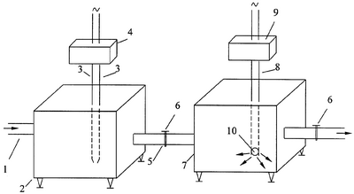 Подлежащая обработке вода по трубопроводу 1 поступает в накопительный бак 2, внутри которого размещены электроды (из вольфрама) 3, подключенные к установке электрогидравлического эффекта 4. Накопительный бак 2 в нижней своей части соединен трубопроводом 5, снабженным краном перекрытия с другим баком 7, в который по шлангу 8 от озонаторной установки 9 подается озон. В нижней части шланга 8 установлена пористая керамическая диафрагма 10 для мелкодисперсного распыления озона. Обработанная вода подается в теплообменную аппаратуру по трубопроводу 11.