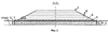 Затем вырезают дренажные прорези 3, согласно изобретению, поперек дорожного полотна с шагом от 4 до 6 м в виде углубления в грунте на глубину до уровня грунта, обладающего фильтрационными свойствами и достаточной несущей способностью, глубиной, например, 4 м, шириной от 1,0 до 1,4 м. Вырезку дренажных прорезей проводят экскаватором с одновременным заполнением их песчано-гравиевой смесью, осуществляемой фронтальным погрузчиком, работающим в едином звене с экскаватором, при этом разрыв между ними не должен превышать 5-10 метров. На уровне поверхности земли в основание насыпи укладывают армирующую прослойку 5 из геотекстиля, при этом ширина укладки должна обеспечивать перекрытие продольных дренажных канав. Раскатка рулонов геотекстиля производится вручную с перехлестом полотен на 22-24 см и закреплением через каждые 1,5 м. Затем приступают к засыпке песчано-гравиевой смеси поверх геотекстиля. Засыпка геотекстиля производится способом “с головы”, толщина слоя 0,6 м (по условию безопасности слабого основания, для которого коэффициент безопасности больше 1), разравнивание осуществляется бульдозером или автогрейдером от середины к краям. Засыпанный песчано-гравиевый слой 6 уплотняют катками без вибрации. Затем отсыпают насыпь 7 слоями 8 из грунта. Каждый отсыпанный слой 8 уплотняют виброуплотнением. Для виброуполтения используют катки 9, которые перемещаются поперек отсыпанного слоя 8. Перемещение катков показано пунктиром.