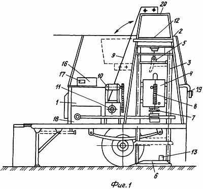 Установка динамического нагружения состоит из прицепа 1, каркаса 2, направляющих 3, груза 4, траверса с крюком 5, штампа 6, пружины 7, механизма захвата груза 8, лебедки 9, электродвигателя 10, редуктора 11, планки 12, преобразователя линейных перемещений 13 (включающий корпус 14 и наконечник 15), соединенного с датчиком 16, на котором имеется электронное табло (показывающее прогиб дорожной одежды в мм) аккумулятора 18, пульта управления 19, колпака (пунктиром показано транспортное положение штампа и колпака) 20, втулки 21, уплотнительных колец 22, соединенных с корпусом 14 преобразователя линейных перемещений 13 и резьбовым соединением 23 преобразователя линейных перемещений 13 и резьбовым соединением 24 отверстия 25 в штампе 6.