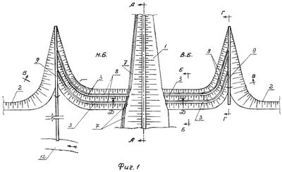 В ВБ и НБ вдоль продольной оси сооружения прокладывают коллекторы 9 (фиг.1, 5) на таком расстоянии от сооружения, чтобы призма обрушения грунта откосов коллекторов 9 с наиболее опасной поверхностью 10 скольжения находилась за пределами тела сооружения. Коллекторы 9 имеют выходы в каньон: в ВБ – в водохранилище 11, в НБ – в водоток 12. Посредством коллекторов 9 открытые каналы 8 сообщены с дном каньона. При этом стоки берегового дренажа 5 ВБ и НБ, а также дренажа 7 сооружения 1 по каналам 8 и коллекторам 9 направляют в каньон.