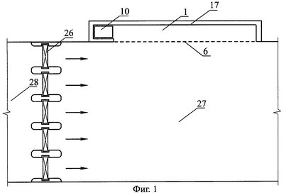 Рыбопропускное сооружение устроено ниже подпорного сооружения 26 в нижнем бьефе 27. Накопленную рыбу переводят транспортным контейнером 10 посредством контейнеровоза 12 и эстакады 13 в верхний бьеф 28.