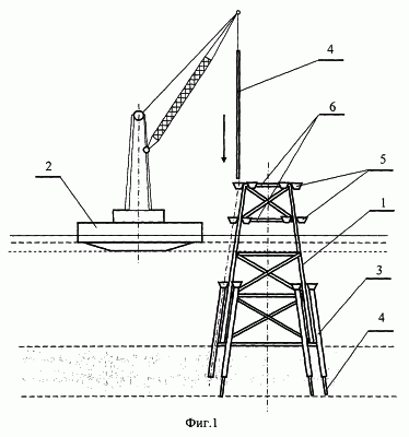 В качестве направляющих элементов для установки направляющего устройства 5 используют трубные элементы 6 основания 1 морской платформы.