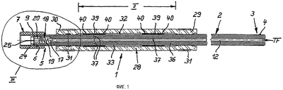 Затвор 1 отверстия дополнительно содержит, как наглядно представляют фиг.1 и 2, охватывающий подающий трубопровод 2 раздуваемый шланг 28. Концы 29, 30 раздуваемого шланга 28 прижаты посредством стальных зажимных колец 31 к внешней поверхности 32 подающего трубопровода 2. Таким образом, между подающим трубопроводом 2 и раздуваемым шлангом 28 образуется продольно проходящее кольцевое пространство 33. Кроме того, можно видеть, что в смежном с отводящим концом 5 подающего трубопровода 2 конце 30 раздуваемого шланга 28 имеется внутреннее кольцевое углубление 34, в которое вставлено прочно охватывающее подающий трубопровод 2 фиксирующее кольцо 35 из стали. Это фиксирующее кольцо 35 имеет задачу фиксации местоположения раздуваемого шланга 28 на подающем трубопроводе 2, когда пропитывающая жидкость TF через продольный канал 12 подающего трубопровода 2 и оканчивающиеся в кольцевом пространстве 33 поперечные каналы 37, которые предусмотрены в стенке 36 подающего трубопровода 2, перетекает в кольцевое пространство 33, чтобы прижать раздуваемый шланг 28 к подробно не показанной стенке отверстия. При этом смежный с отводящим концом 5 подающего трубопровода 2 конец 30 раздуваемого шланга 28 остается жестко прилегающим к подающему трубопроводу 2, в то время как подающий трубопровод 2 может относительно перемещаться к другому концу 29 раздуваемого шланга 28.