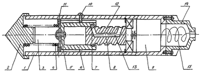 На чертеже представлена схема бурового снаряда ударного действия. Снаряд содержит цилиндрический корпус 1, имеющий ударный наконечник 2, с которым связан боек 3 через пружину 4. С бойком посредством тяги 5 соединен механизм натяжения пружины, включающий стакан 6 с шариком 7, размещенным в кольцевой расточке, выполненной в отверстии стакана со стороны входа стержня. В стакане установлен стержень 8, имеющий с ним зацепление посредством шарика. Стержень связан с приводным электродвигателем 9 вращательного действия. Стакан имеет продольный паз, в который входит фиксатор 10 для предотвращения его проворота относительно корпуса. В корпусе также установлен ограничитель хода стакана 11. На наружной поверхности стержня выполнена винтовая канавка 12, крайние выходы которой соединены осевым каналом возврата шарика 13. В верхней части корпуса за электродвигателем выполнен кабельный отсек 14 с бухтой кабеля 15 для подвода электроэнергии.