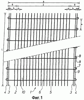 Сумма всех осевых расстояний а, b, с и вылетов d петель дает общую ширину В арматурной сетки 1. Обычно ширину В сетки выбирают как можно меньшей стандартной величины, причем во всем мире экономически особенно предпочтительным стандартом зарекомендовала себя общая ширина 2400 мм, соответствующая ширине погрузки транспортных средств для арматурных сеток. Арматурные сетки 1 согласно изобретению изготовляют на основе этого стандарта постоянной общей шириной 2400 мм. За счет постоянных осевых расстояний с, равных 50 мм, постоянных осевых расстояний b, равных 200 мм, и постоянных вылетов d петель, равных 50 мм, возникают краевые зоны R постоянной ширины 300 мм, так что центральная зона Z арматурной сетки 1 имеет постоянную ширину 1800 мм.