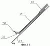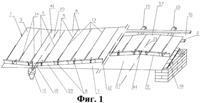 На расстоянии, например, 0,2 м от оси 21 водораздела (фиг.2), в сторону лотка 10, аналогичным образом закрепляется аналогичным образом другая металлическая полоса 40, конструкция которой идентична конструкции описанной выше первой металлической полосы 34 (фиг.6). Нижний гвоздь в нее также забивается не полностью.