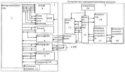 Устройство санкционирования доступа работает следующим образом. Работа устройства включает два этапа: подготовительный и эксплуатационный. На подготовительном этапе осуществляется установка кодов и специальной информации в интеллектуальный ключ (ИК) 1 и электронный замок (ЭЗ) 2 для обеспечения кодовой синхронизации между кодером 6 и декодером 12, при этом количество ЭЗ 2 соответствует количеству объектов доступа. Для этого ИК 1 через интерфейс 8 подключается к персональному компьютеру (ПК) (не показан), на который предварительно устанавливается специальное программное обеспечение. С помощью ПК для каждого ЭЗ 2 рассчитывается кодовая информация, а затем через интерфейс 8 записывается в РПЗУ микроконтроллера 3. Часть кодовой информации микроконтроллер 3 записывает в ОЗУ часов 5 реального времени и одновременно с этим выводит информацию в виде поясняющих надписей на устройство 4 отображения информации. Тактирование микроконтроллера 3 осуществляется генератором 10. После того как в РПЗУ микроконтроллера 3 и ОЗУ часов 5 реального времени будет записано количество кодовых записей, соответствующее количеству ЭЗ 2, с ПК через интерфейс 8 на микроконтроллер 3 посылается команда перевода ИК 1 в режим обучения ЭЗ 2. После этого первое ЭЗ 2 из комплекта устанавливается рядом с ИК 1. Микроконтроллер 3 посылает служебную команду “обучение” через интерфейс 7 и интерфейс 13 на микроконтроллер 15. После декодирования команды микроконтроллер 15 переводит декодер 12 в режим обучения и данное состояние высвечивает на индикаторе 16. Затем микроконтроллер 3 программирует кодер 6 в соответствии с кодовой записью в РПЗУ микроконтроллера 3 и ОЗУ часов 5 реального времени, соответствующей первому ЭЗ 2, после чего переводит кодер 6 в режим передачи, который, в свою очередь, осуществляет передачу кодовой посылки через интерфейс 7, интерфейс 13 в декодер 12. Ответная команда с декодера 12 поступает на микроконтроллер 15, который передает ее через интерфейс 13 и интерфейс 7 на микроконтроллер 3. Тактовая частота на входы микроконтроллера 15 и декодера 12 поступает с выхода генератора 14. После этого микроконтроллер 3 через интерфейс 7 и интерфейс 13 посылает служебную команду “отмена обучения” на микроконтроллер 15, который выводит декодер 12 из режима обучения и высвечивает на индикаторе 16 соответствующее состояние. После этого процесс установления кодовой синхронизации между первым ЭЗ 2 и ИК 1 считается законченным. После того как процедура повторится для каждого ЭЗ 2, подготовительный этап считается законченным.