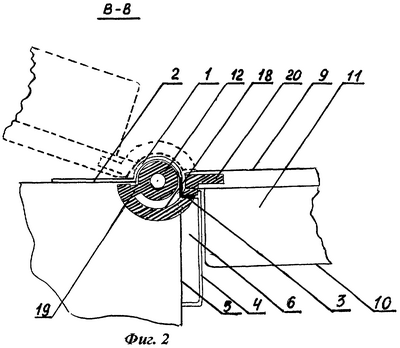 Дверь выполнена из двух полотен – внешнего 9 и внутреннего 10, например металлических листов, между которыми размещен утеплительный материал 11. Петля выполнена в виде втулки 12, установленной на стержень 13 шарнира и жестко закреплена на нем с помощью винта 14. Стержень 13 шарнира установлен во втулку 15, которая жестко закреплена на внутренней поверхности стойки 1 полукруглого профиля, например, приварена (не показано). Стержень 13 шарнира может быть установлен во втулку 15 на стальные шарики 16, выполненные из шарикоподшипниковой стали ГОСТ 4727-79, через металлические прокладки 17 из этого же материала. Втулка 12 снабжена цилиндрической скобой 18 в виде дуги кругового сечения, один конец которой жестко связан со втулкой 12 через мостик 19, другим концом с помощью пластины 20 закреплен на внутренней части наружного дверного полотна 9, например закреплен в металлической коробке, установленной в двери (не показано). Для установки петли и хода скобы в уголке 3 выполнен паз (окно) (на фиг.2 показан темньм). Глубина его не должна выходить за пределы области, не доступной для обозрения извне, т.е. в плоскости чертежа за пределы наружной плоскости 9 двери. В стене у дверного проема 5 и в полости, заполненной бетонным раствором 6, под движение скобы выполнен паз.