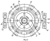 На верхнее основание корпуса 1 установлена тормозная система, состоящая из обоймы 32, с радиально размещенными внутри нее восью гидроцилиндрами 33, четырех тормозных колодок 34 и тормозного шкива 35, жестко скрепленного дюбелями 36 с механизмом зажима труб 5.