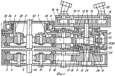 В свою очередь водило 25 установлено на подшипниках качения 28 во внутренние расточки корпуса 21.
