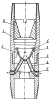 1. Устройство для кольматации стенок скважины, включающее полый корпус, установленный в его полости на входе диффузор с плавно уменьшающимся по ходу движения бурового раствора проходным сечением и имеющий возможность регулировочного осевого перемещения, закрепленную в корпусе под диффузором полую ловушку, кольматирующие сопла, соединяющие полость ловушки с затрубным пространством через патрубки, отличающееся тем, что оно снабжено переходником, имеющим резьбовое соединение с полым корпусом, а кольматирующие сопла установлены в отверстиях стенки переходника.